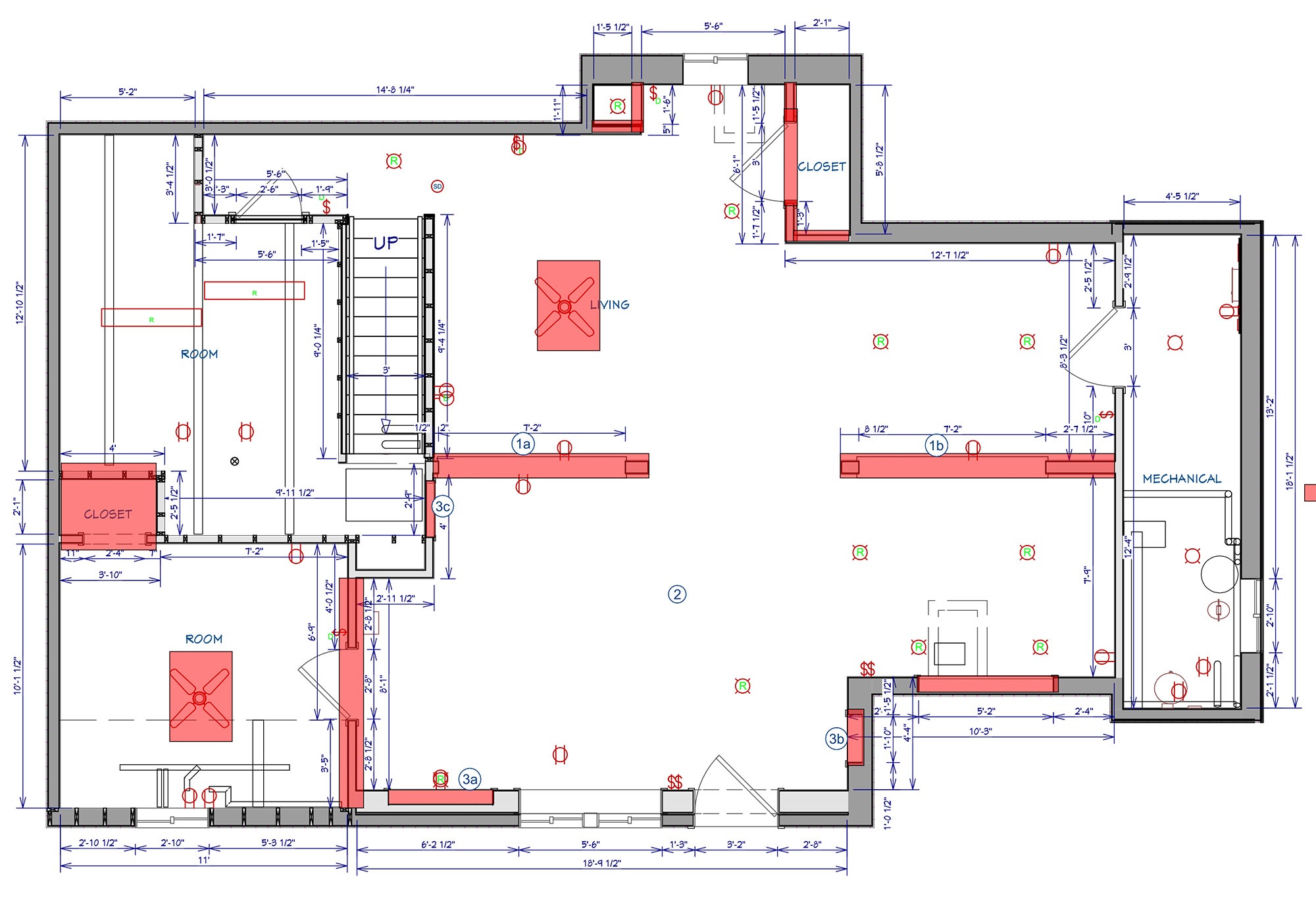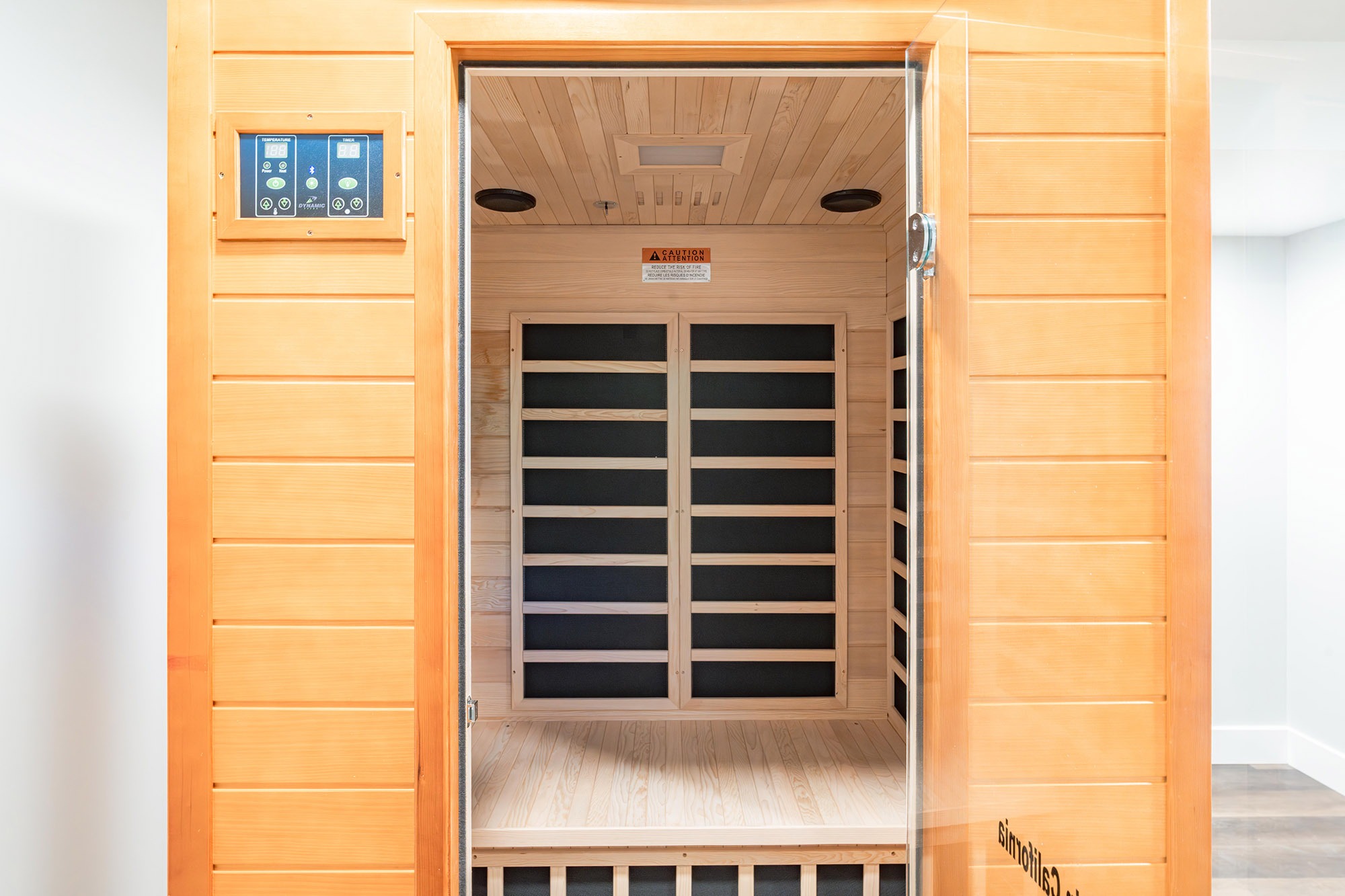 The redesigned space features an open layout with defined zones for living, fitness, and hospitality. The main area includes a sleek kitchenette, while the lounge doubles as a living or entertainment room. The gym is upgraded with wall mirrors and an infrared sauna. Mechanical and storage spaces are kept accessible but hidden. Enhanced lighting includes recessed fixtures, motion sensors in the gym, and under-cabinet illumination.