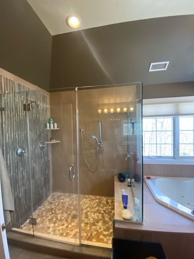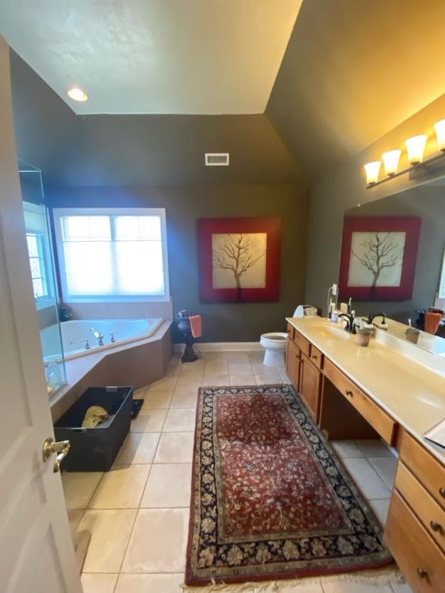 The original bathroom configuration included a large corner soaking tub beneath the window, a single-sink vanity that limited usable counter space, and a small enclosed shower area. The room’s layout made it feel smaller than its actual size, and the dark wall color combined with outdated finishes absorbed light rather than reflecting it. Circulation within the space was awkward, with wasted square footage around the tub and minimal storage. The ceiling vault was present but underutilized, and overall, the design lacked visual flow and modern comfort. The original plan, as documented in the as-built drawings, clearly showed the separation between the vanity, tub, and shower areas that this renovation sought to unify.NEW FLOOR PLAN