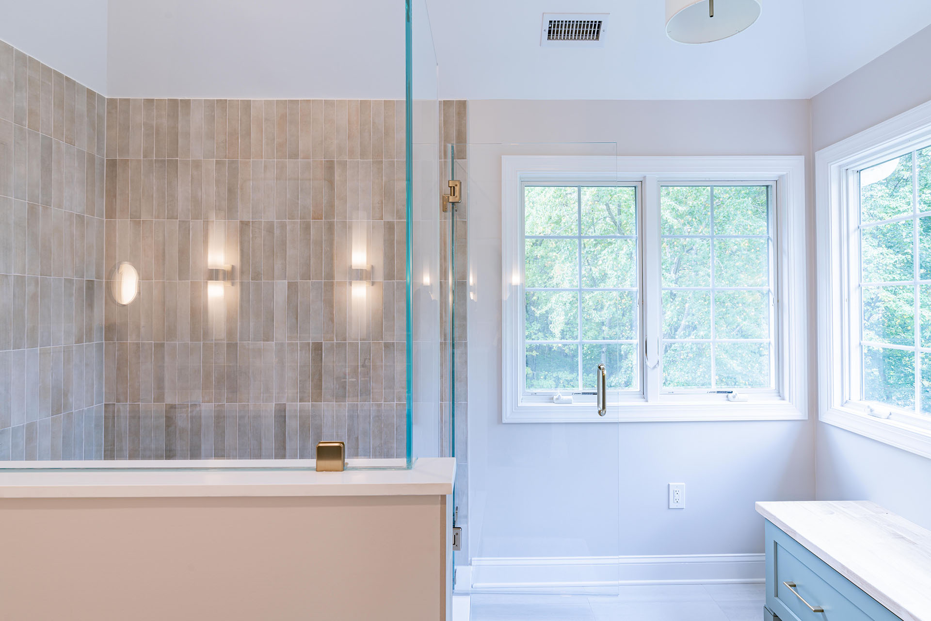 The finish palette was designed to evoke calmness and natural balance. The floor is clad in Garden State Tile Anthem Steel White porcelain in a matte finish, chosen for its subtle texture and durability. The shower walls are finished with Bedrosians Celine tiles in Taupe, stacked vertically to elongate the walls visually. The shower floor features Herringbone Mosaic in honed marble, providing soft contrast and tactile warmth. The wall color, Balboa Mist in a matte Aura Bath & Spa finish, complements the natural stone and tile while keeping the atmosphere light and inviting.