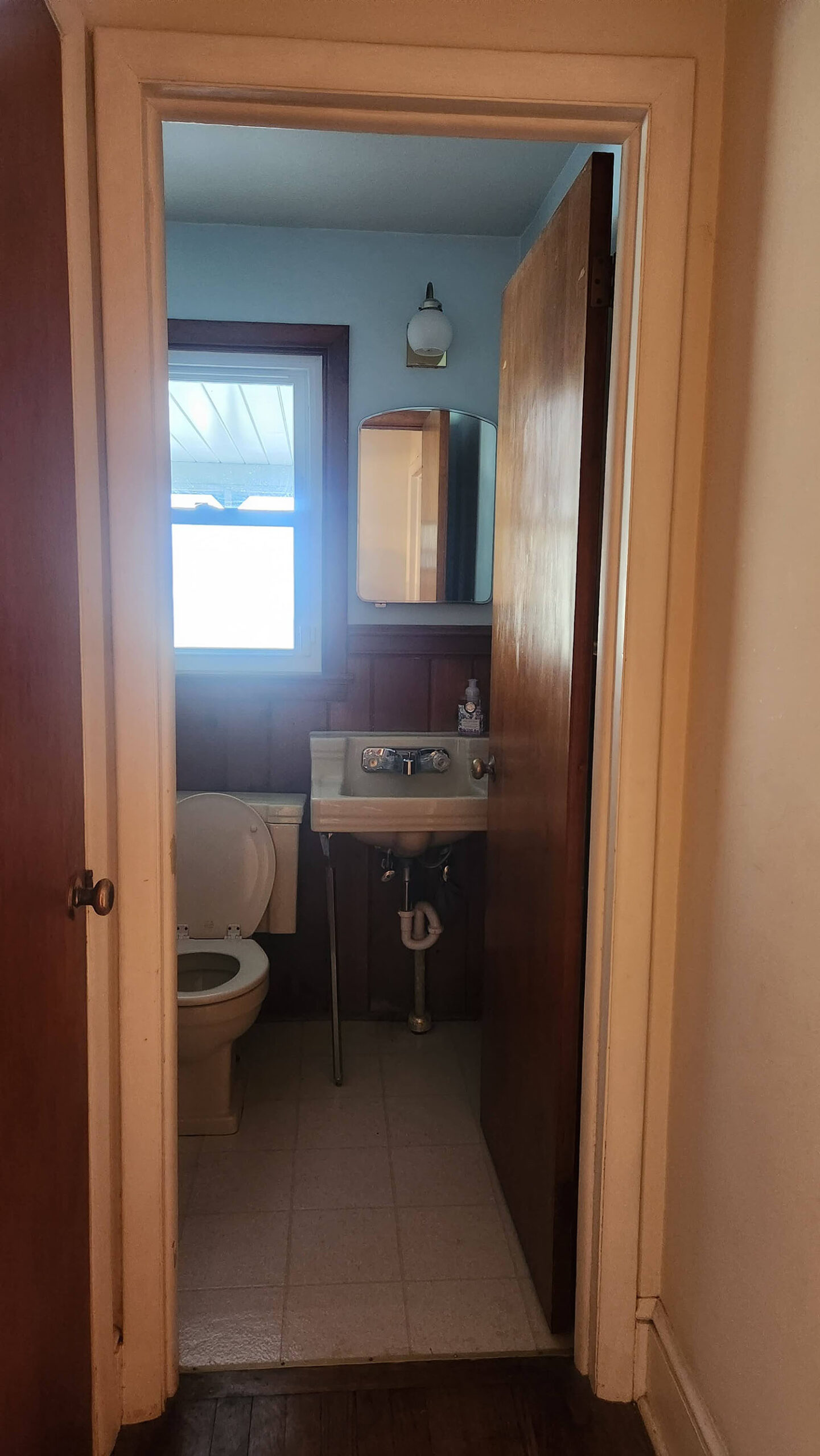 The original powder room floor plan was compromised when the family added a sunroom, leaving the space with nothing but wooden boards covering the window. The narrow entryway and a closet dominated the room, making it feel cramped.
