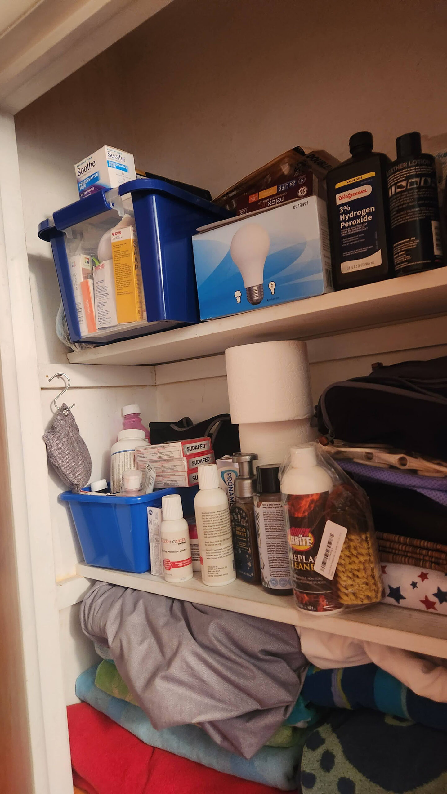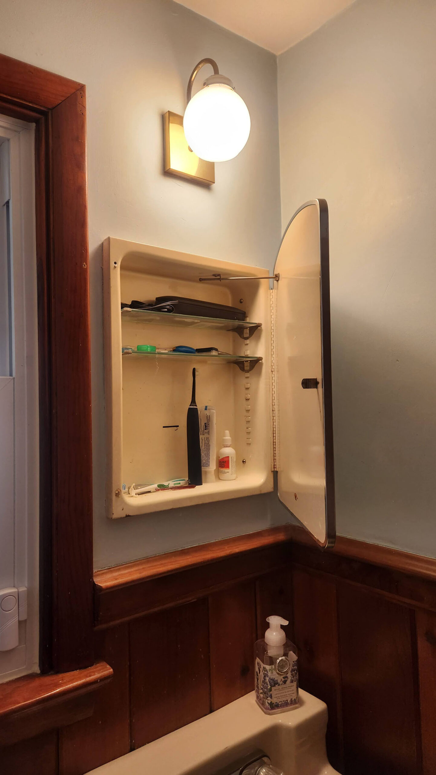 The hallway bathroom consisted of the same cramped style with one opening of space not used for anything functional at all.