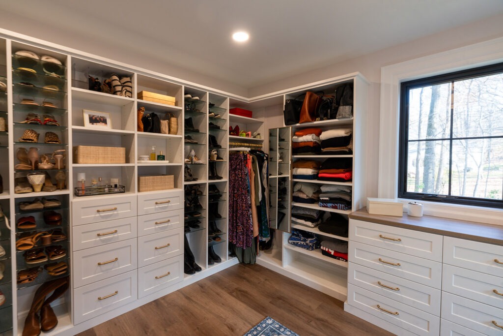The green custom-built cabinetry added a bold yet timeless touch, offering practical storage solutions while enhancing the aesthetics of both the home office and the master closet. The walk-in closet also features maximum storage efficiency for all accessories, dirty laundry, and shoes. Drawers and open shelving systems provided a mix of display and hidden storage, allowing for organization and style in equal measure.