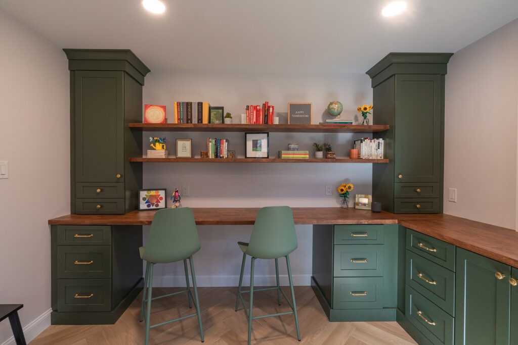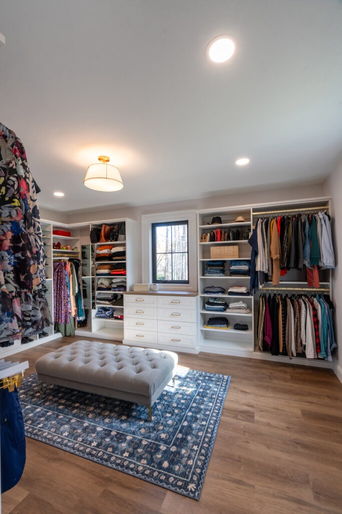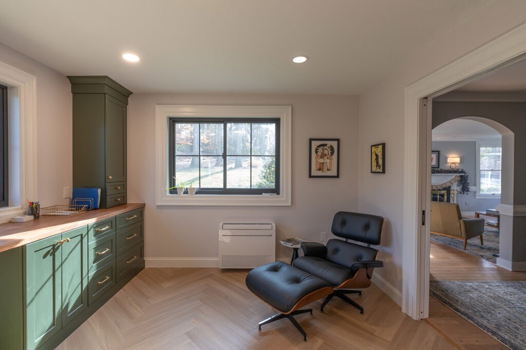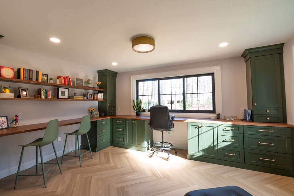 While the focus of this addition was on workspace and closet functionality, any minor tile accents complemented the design concept’s modern aesthetic, featuring soft, natural textures and hues. The flooring choice of LVP herringbone was both stylish and durable, creating a seamless flow throughout the renovated spaces while being ideal for family activities.