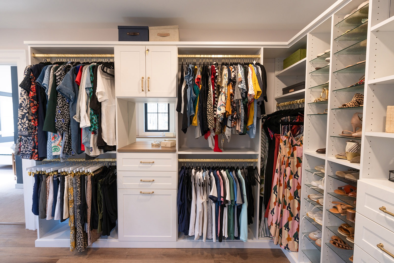 The green custom-built cabinetry added a bold yet timeless touch, offering practical storage solutions while enhancing the aesthetics of both the home office and the master closet. The walk-in closet also features maximum storage efficiency for all accessories, dirty laundry, and shoes. Drawers and open shelving systems provided a mix of display and hidden storage, allowing for organization and style in equal measure.