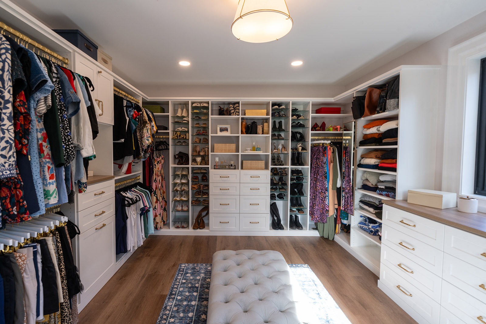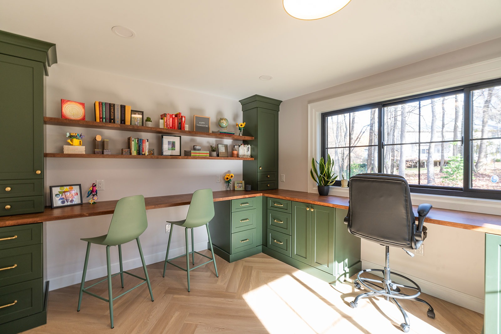 While the focus of this addition was on workspace and closet functionality, any minor tile accents complemented the design concept’s modern aesthetic, featuring soft, natural textures and hues. The flooring choice of LVP herringbone was both stylish and durable, creating a seamless flow throughout the renovated spaces while being ideal for family activities.
