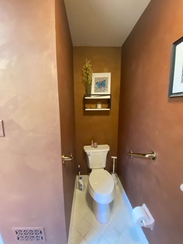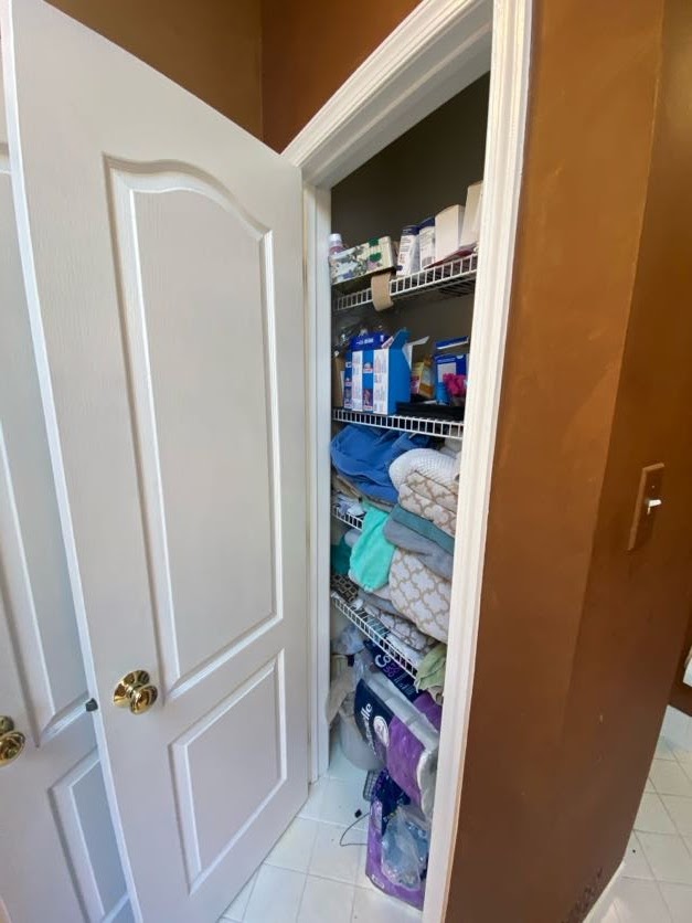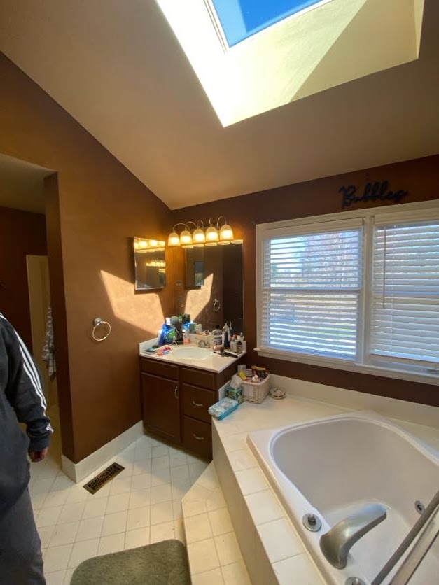 In the primary bathroom, the corner platform tub consumed an unnecessary amount of floor space, while the brown walls and bulky vanity absorbed light from the skylight rather than reflecting it. Storage was limited to wire shelving and cabinetry that lacked structure and intentionality, and the overall room layout did not support the clients’ morning routines.