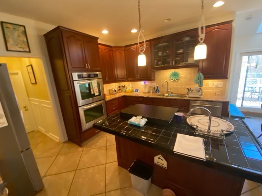 Before renovation, the kitchen felt heavy and enclosed, with deep, dark cabinetry and a tile countertop that shortened sightlines and limited workspace. Circulation between appliances was restricted, and the island did not support the way the clients lived day to day. The dining and family room sat adjacent, but did not fully integrate with the kitchen, leaving the spaces feeling disconnected.