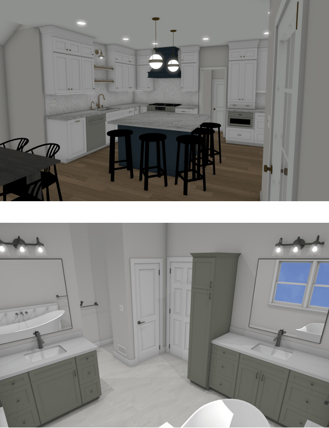 Both rooms lean into a palette of soft neutrals with elevated contrast. Marble-look quartz with organic veining introduces movement across countertops and the bathroom knee wall. The kitchen features a herringbone backsplash in a warm gray tone, paired with brass hardware and lighting for subtle luxury. The island and hood are finished in a deep slate blue to define the space. Bathroom finishes include vertical-stacked wall tile, matte hexagon mosaic flooring in the shower, and soft green shaker cabinetry that adds color without overwhelming the room. Metals are consistent throughout to maintain cohesion.