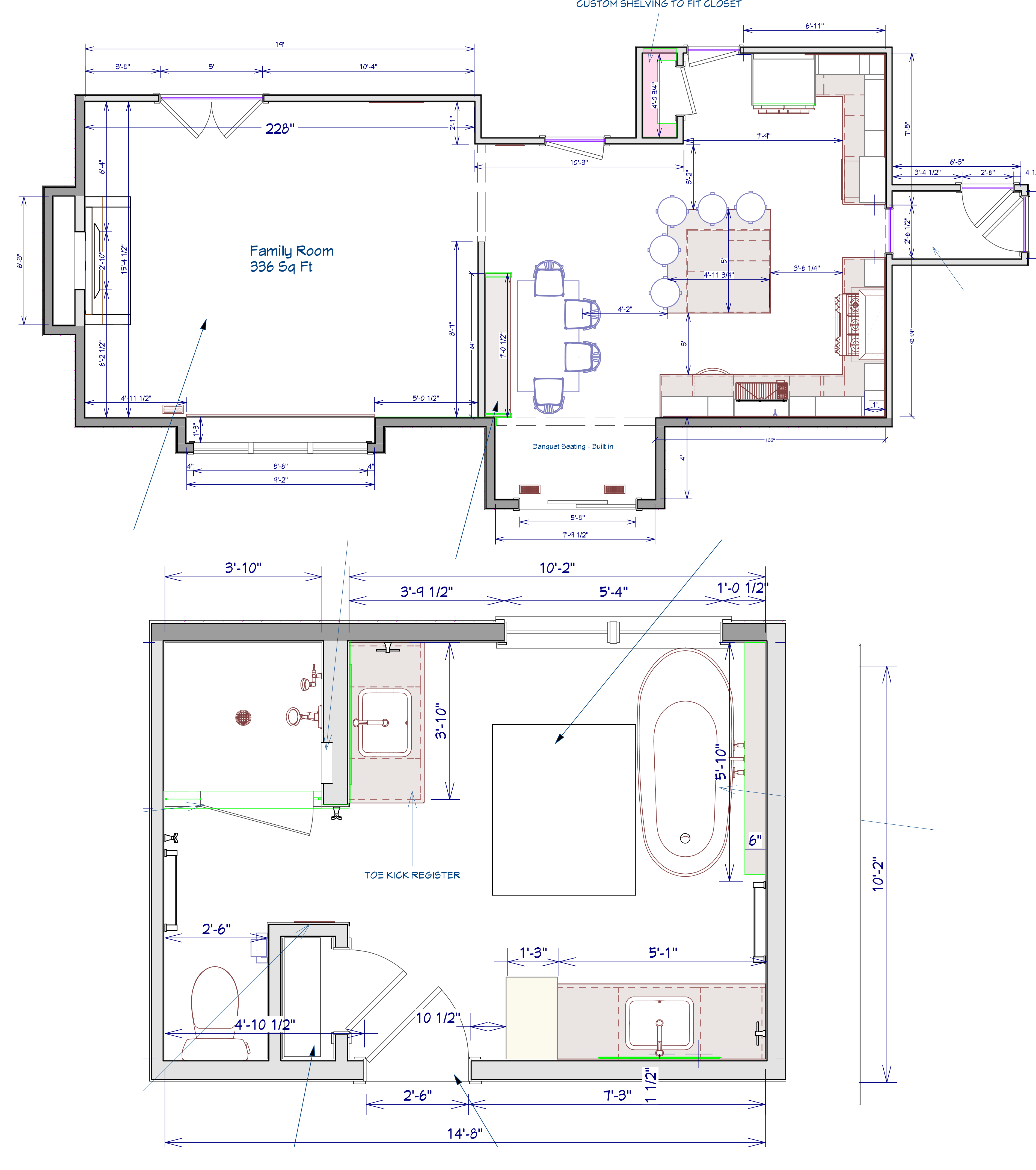 The updated kitchen establishes a more functional footprint with intentional appliance placement and work zones that support cooking, hosting, and daily living. The island is extended to offer comfortable seating and generous prep space, while banquette seating along the existing half wall creates a natural dining transition between the kitchen and family room. Floating shelves with integrated lighting add display potential and warmth, and the reconfigured cabinetry provides structured, purposeful storage.