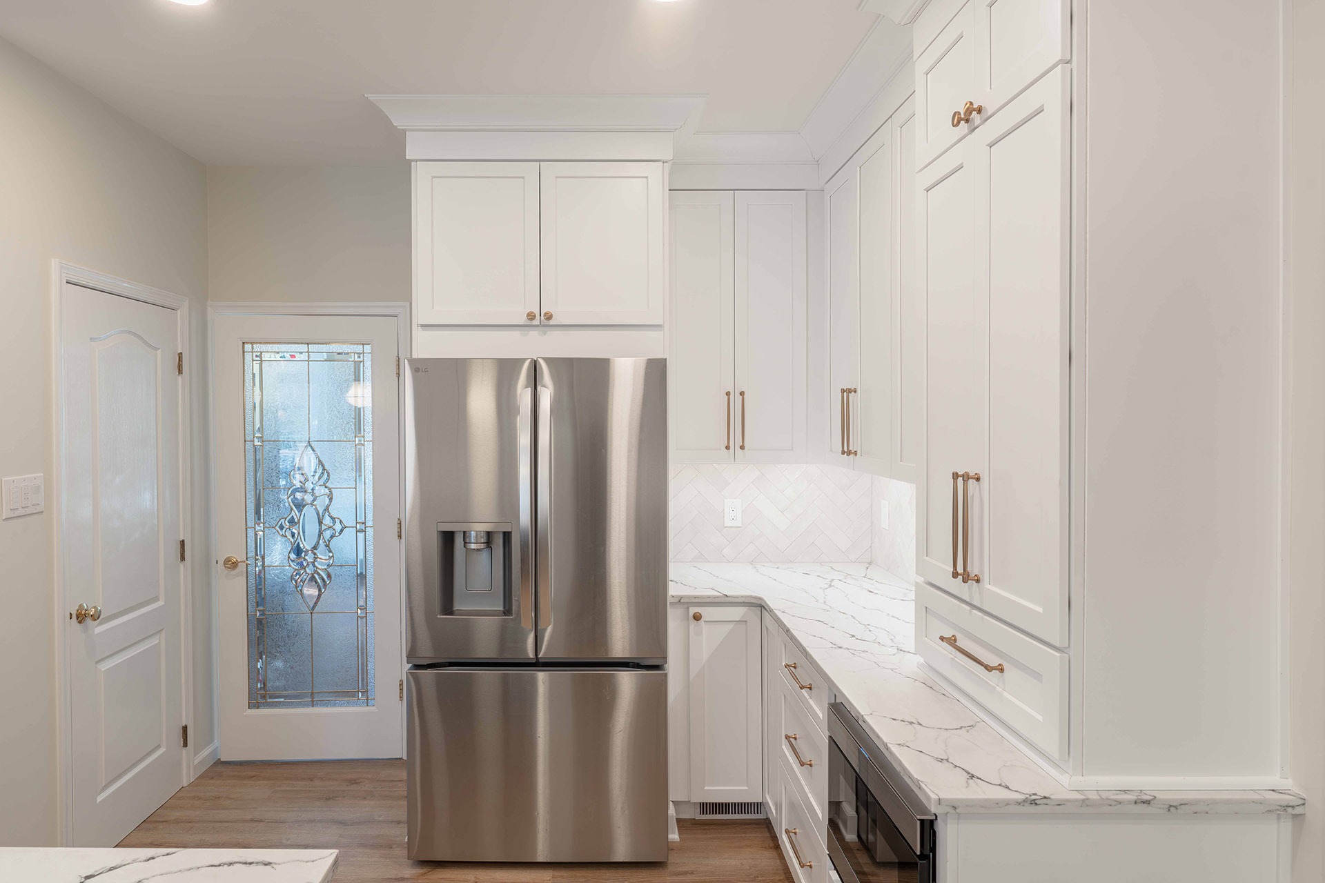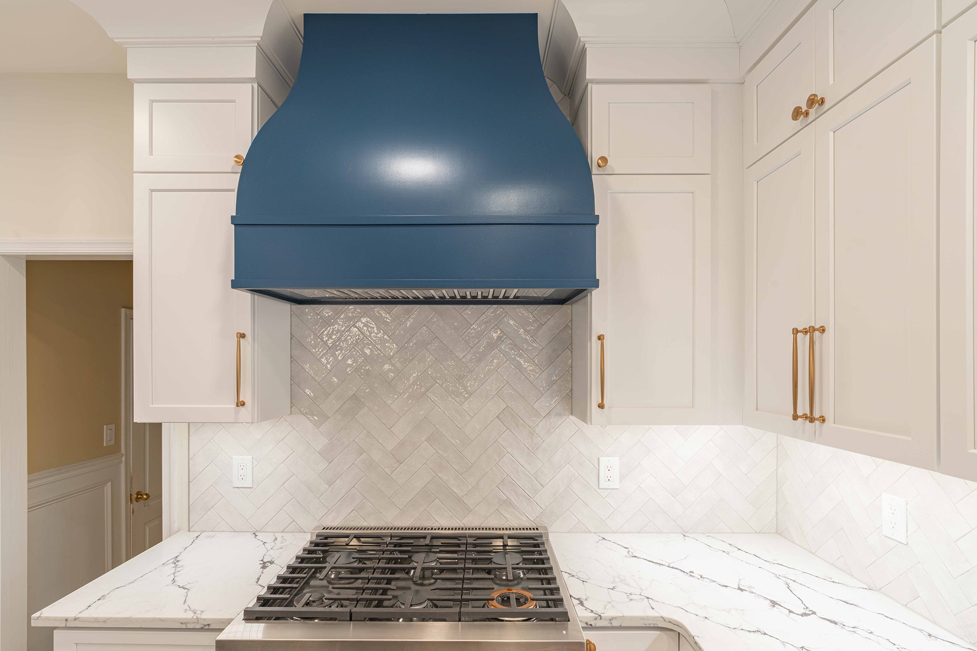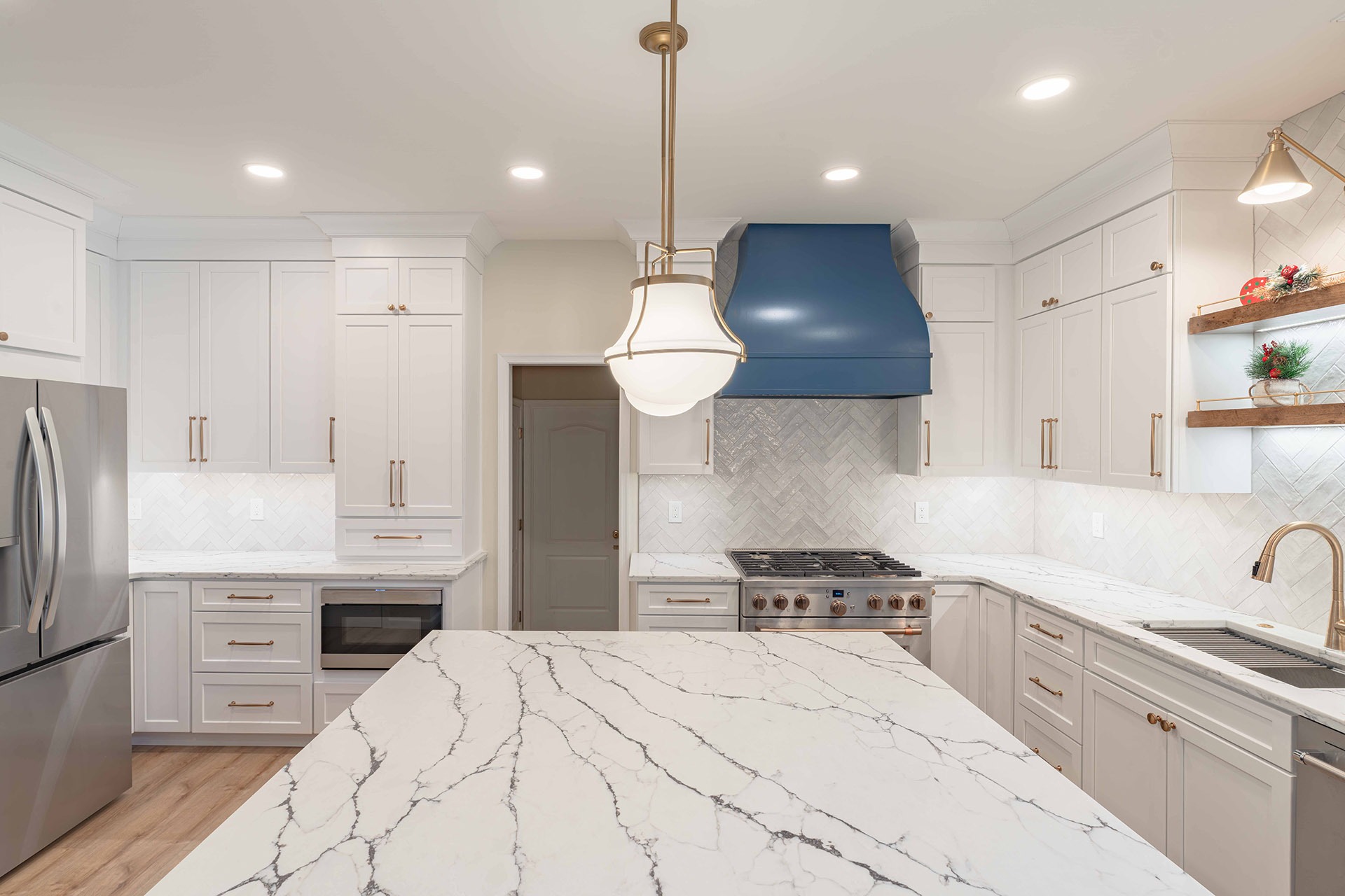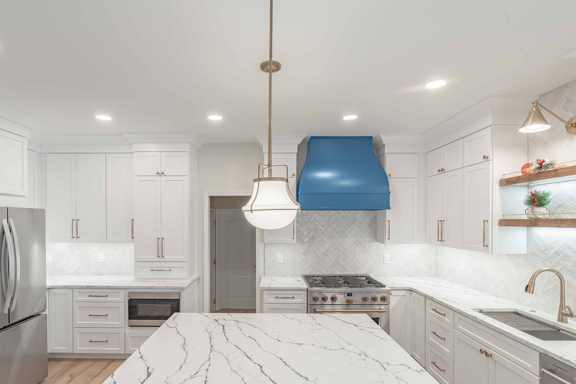 This remodel centers on light, warmth, and connection. The kitchen was redesigned to feel calm and coastal, pairing soft neutral cabinetry with a bold blue island and hood for balanced visual weight. Warm metal tones, updated lighting, and layered storage create a space that feels both elevated and inviting, encouraging gathering in the heart of the home.