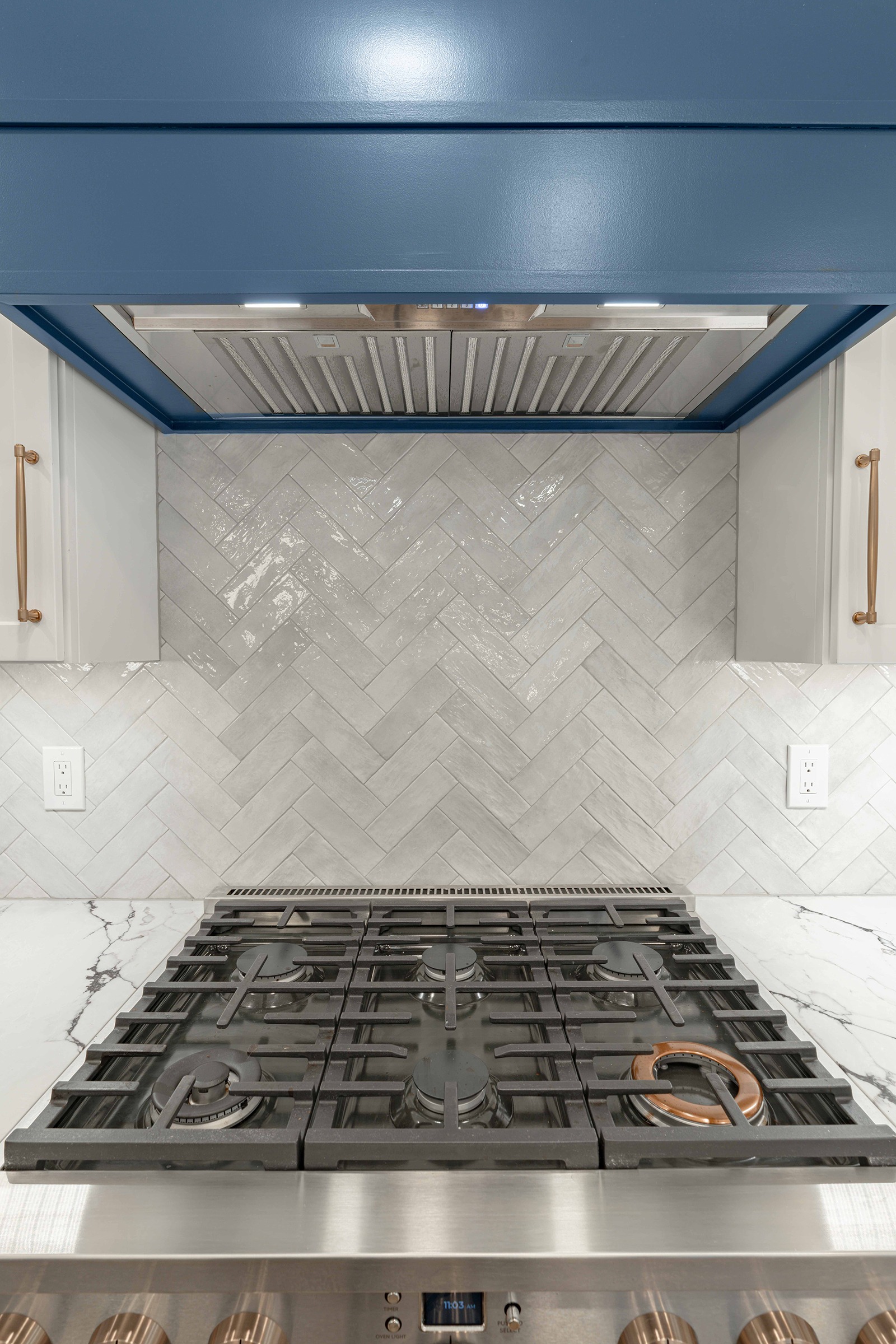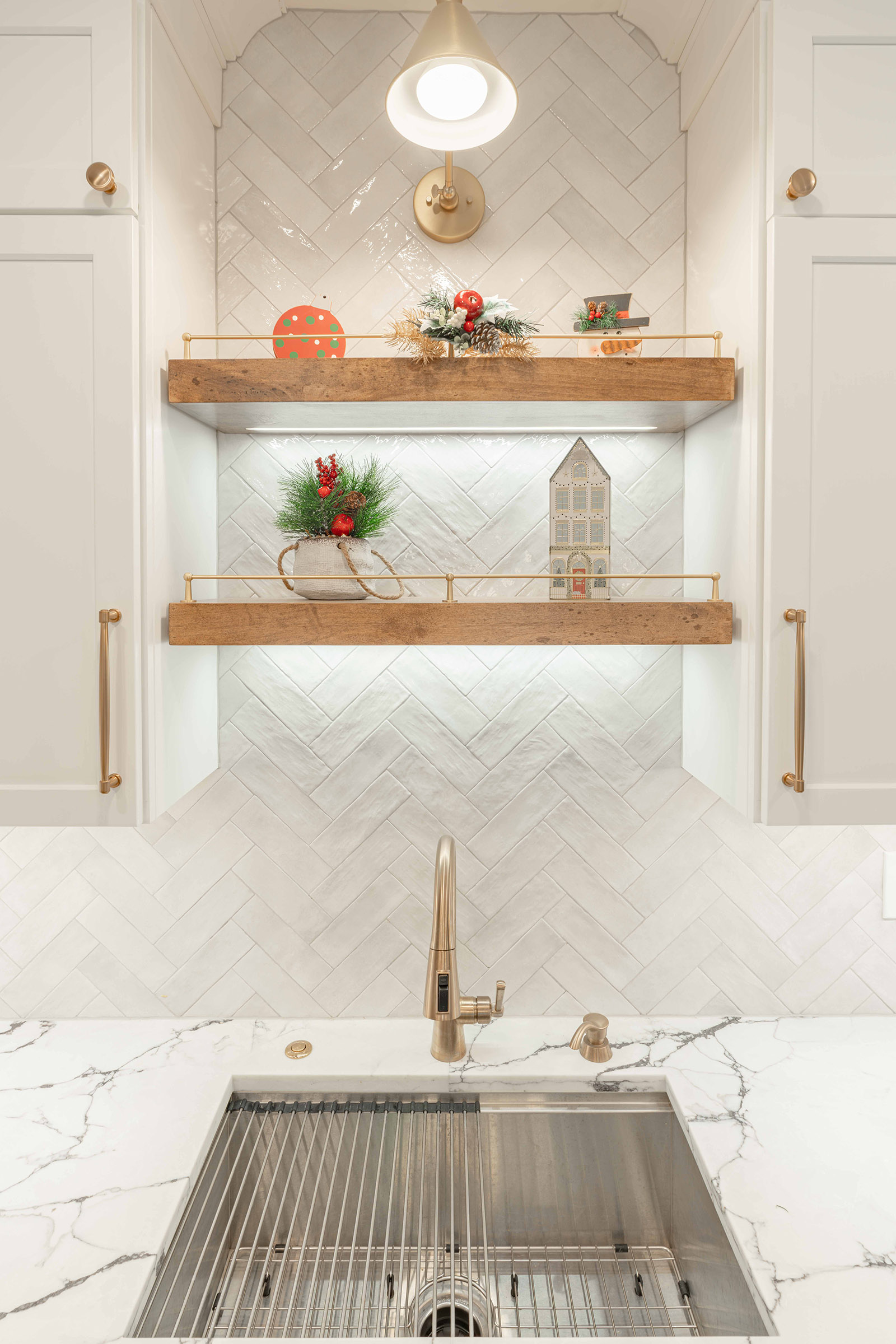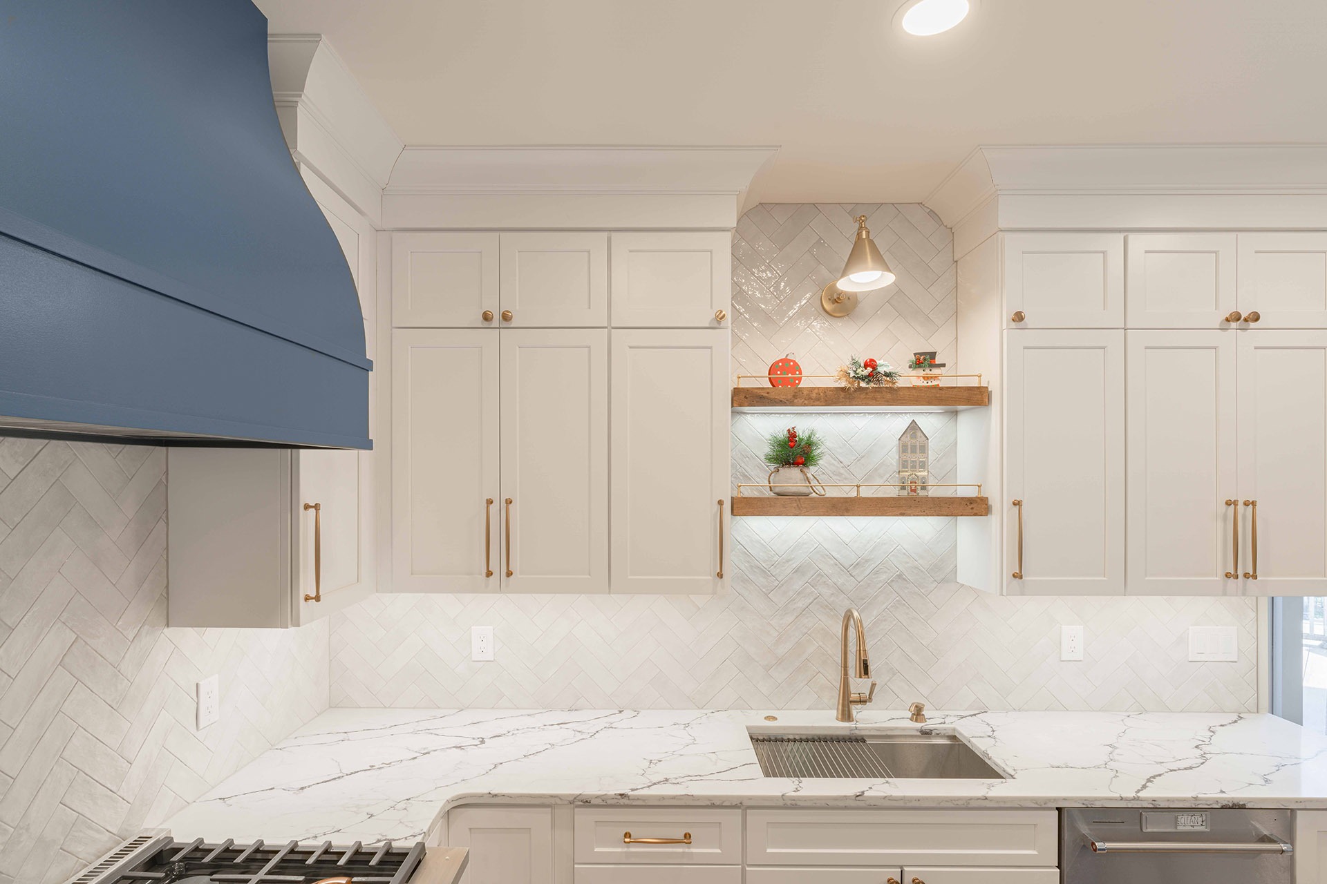 Marble-inspired quartz counters, matching shower curb, and a four-inch backsplash establish continuity and reduce visual clutter. Kitchen backsplash tile in a soft gray set in a herringbone pattern becomes a feature behind the hood and shelving. In the bathroom, vertically-stacked large format tile elevates the look.