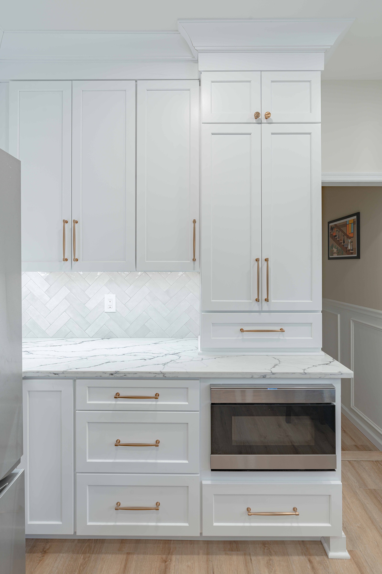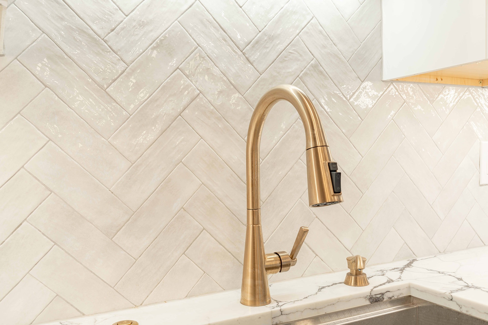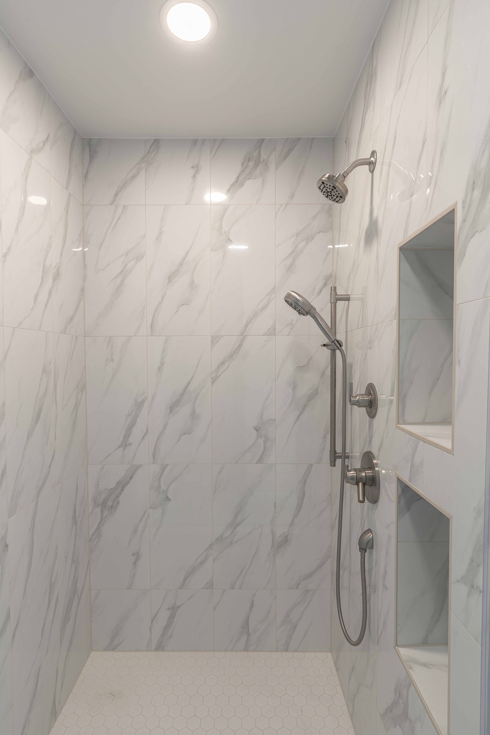 Marble-inspired quartz counters, matching shower curb, and a four-inch backsplash establish continuity and reduce visual clutter. Kitchen backsplash tile in a soft gray set in a herringbone pattern becomes a feature behind the hood and shelving. In the bathroom, vertically-stacked large format tile elevates the look.