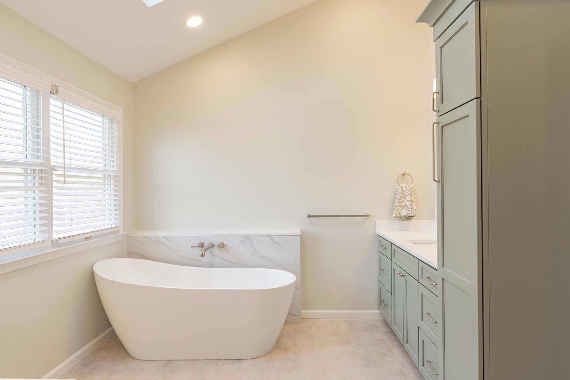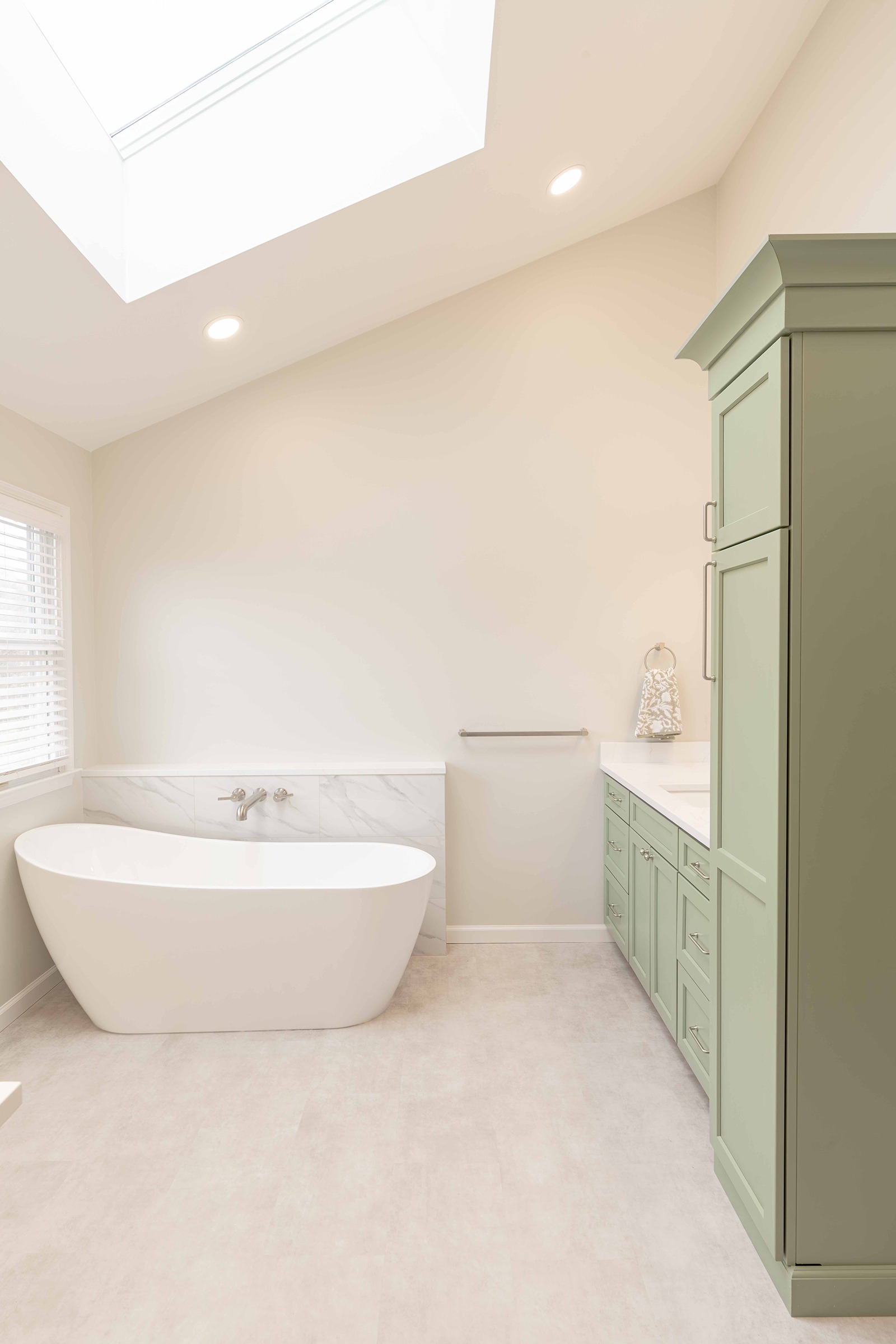 The primary bathroom now features a freestanding soaking tub below the skylight, allowing natural light to anchor the space. The new double vanity offers tailored storage and integrated electrical within the cabinetry. Materials were selected to promote calm: soft green cabinetry, marble-look surfaces, and white tile with subtle movement. Updated plumbing fixtures, tile, and lighting complete the space with a modern yet timeless finish.