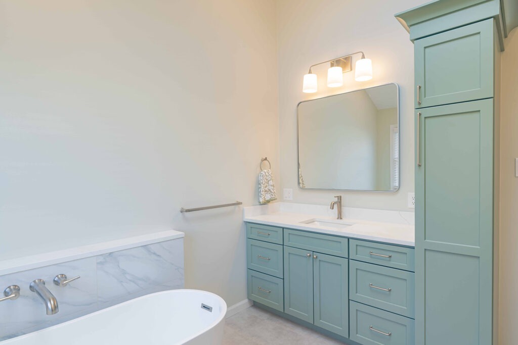 The primary bathroom was transformed into a serene retreat, replacing the oversized corner tub and dark finishes with clean lines, soothing greens, and a freestanding soaking tub. Natural light now defines the atmosphere, creating a spa-like escape at home.