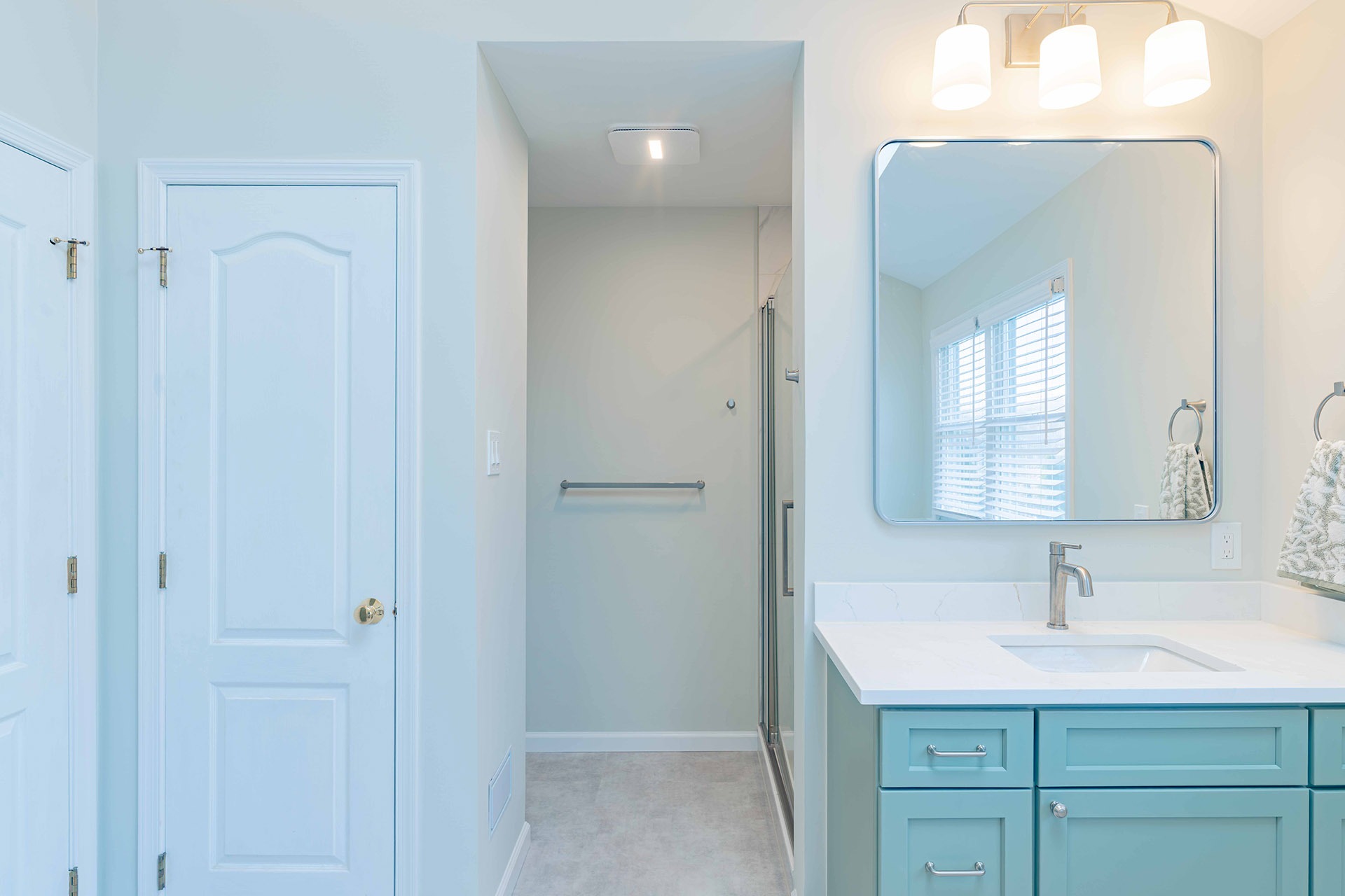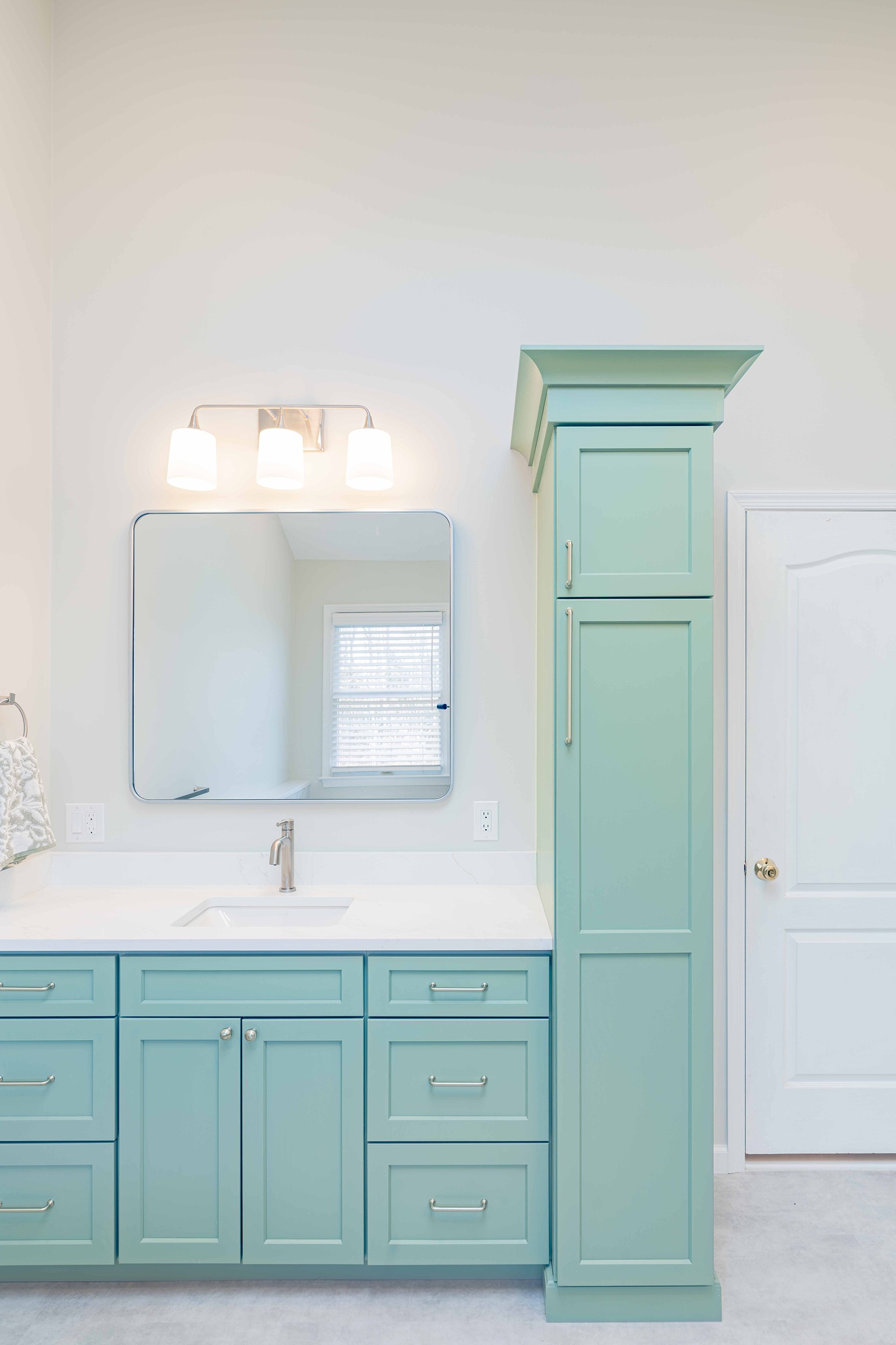 The cabinetry in both spaces is full-overlay shaker in a soft white for the kitchen perimeter and a deep blue for the island and hood. The bathroom features the same door style in a muted green that feels fresh but grounded. Storage solutions include utensil dividers, a pull-out spice cabinet, tray dividers, and a vanity outlet drawer for heat tools. All cabinetry is designed to maximize functionality without compromising visual clarity.