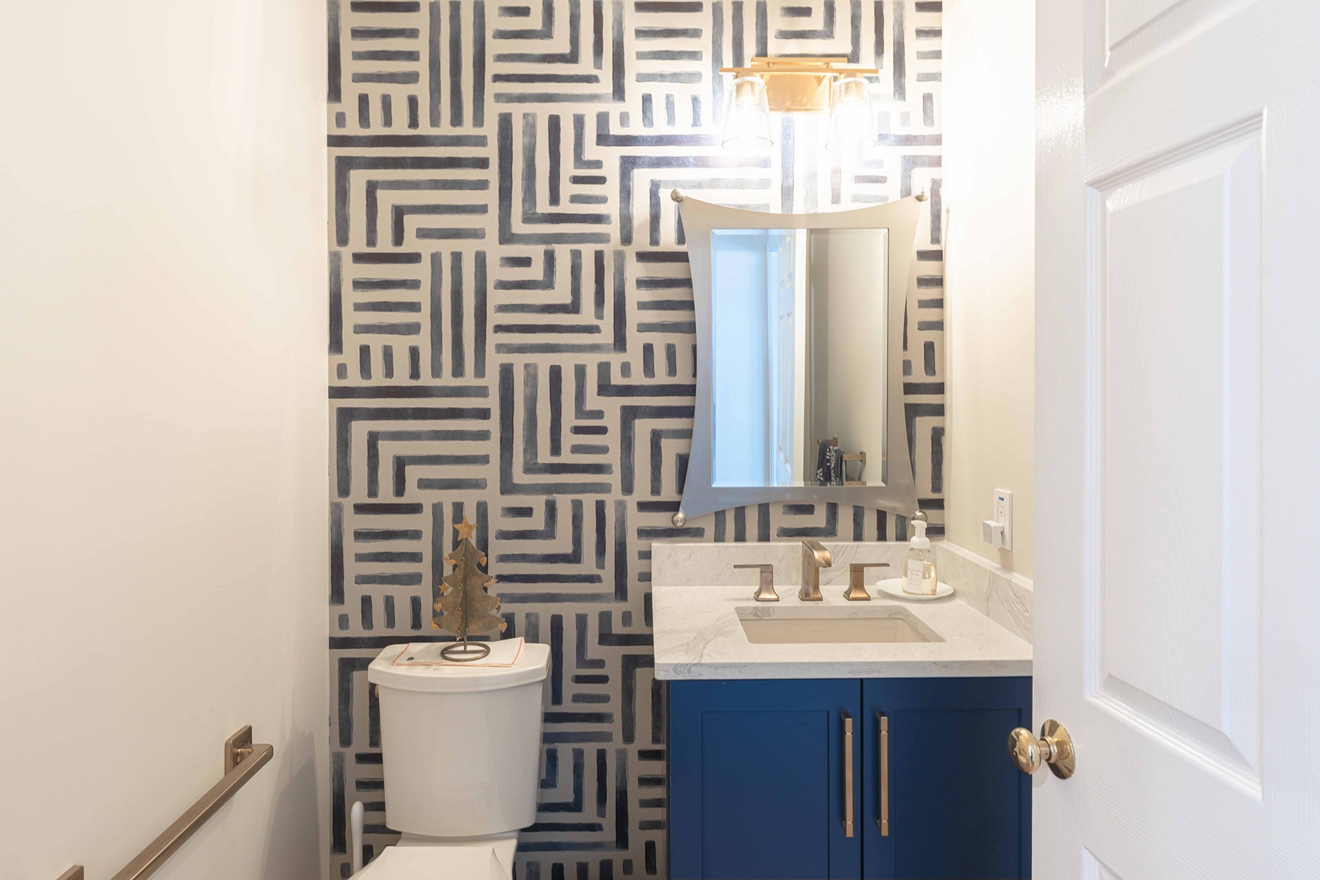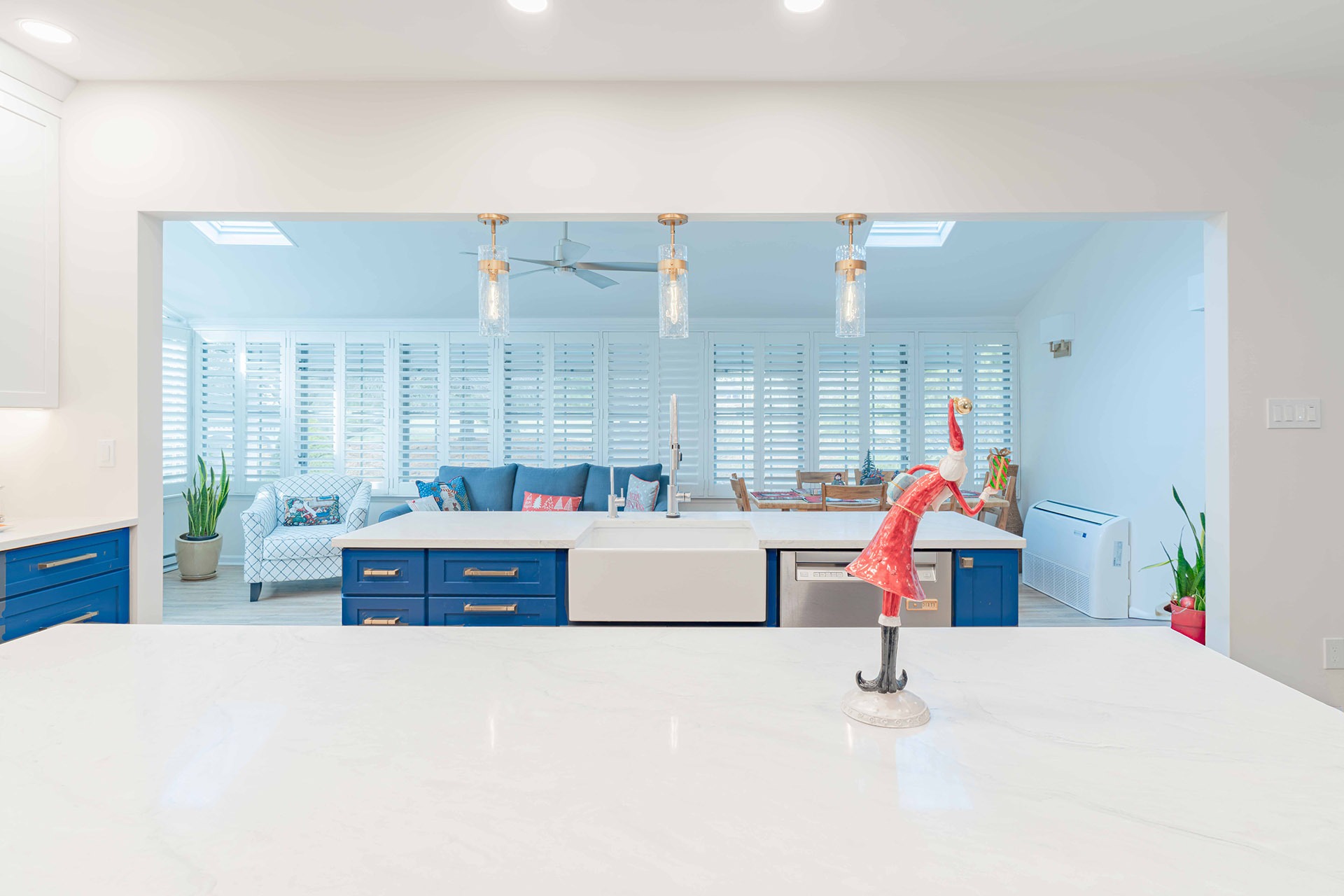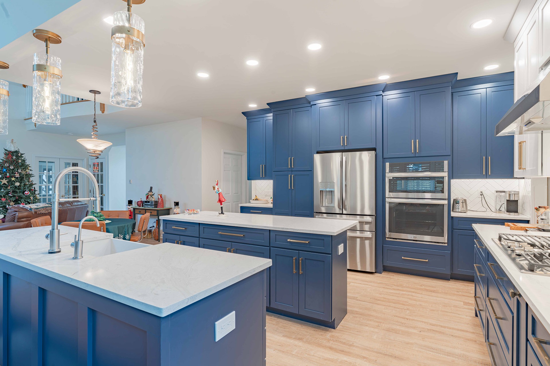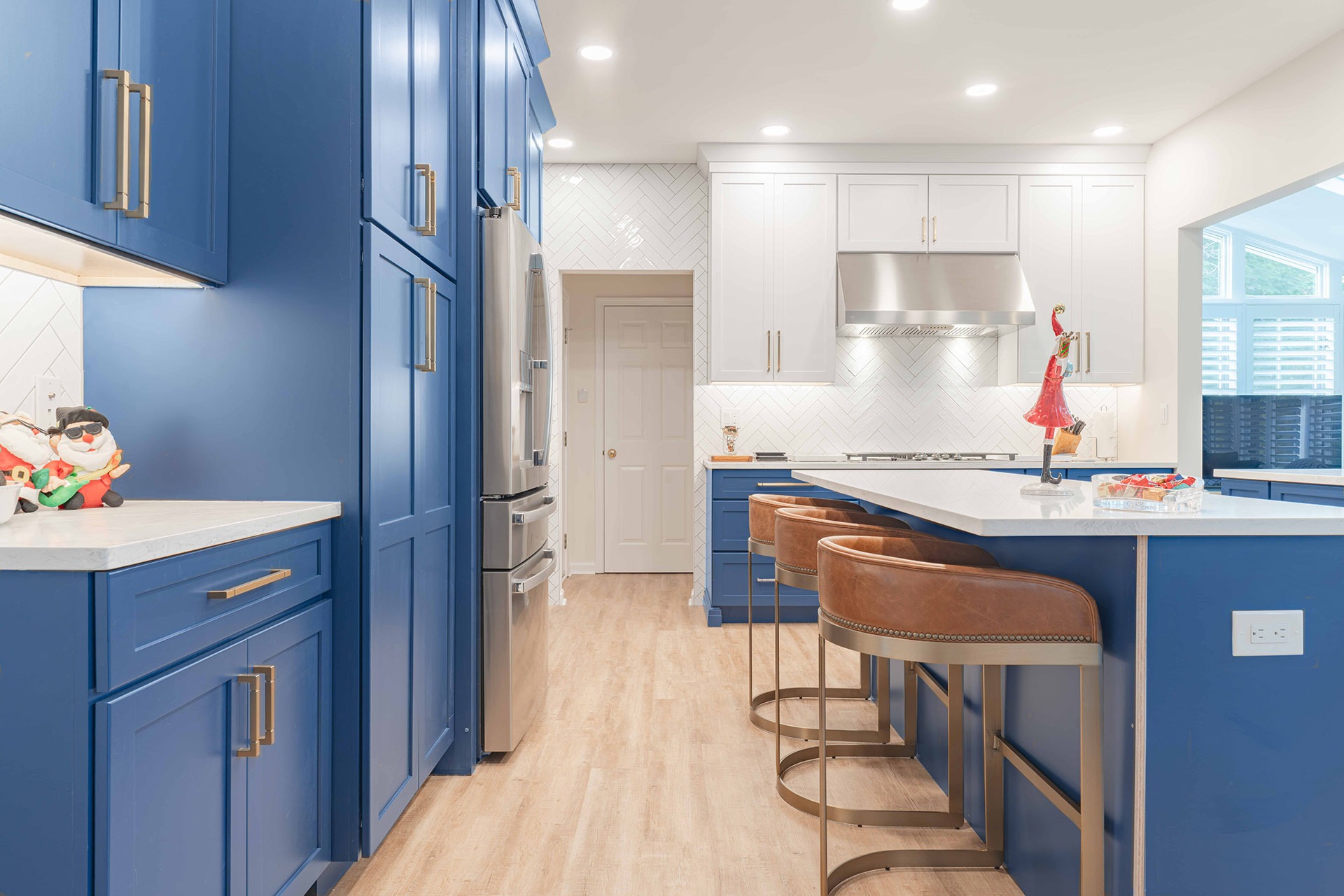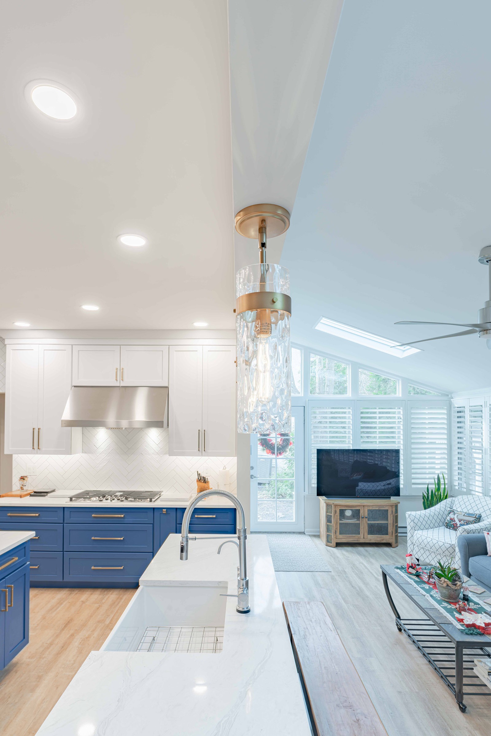 This remodel reimagines the kitchen as an open, welcoming hub where cooking, gathering, and connecting all happen seamlessly. The new design introduces balance, symmetry, and a rich visual palette that mixes deep blue cabinetry with soft white accents, warm brass finishes, and layered lighting. Every detail is selected to feel current yet timeless, creating a tailored, upscale atmosphere that still feels comfortable for everyday living.