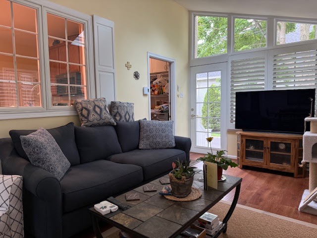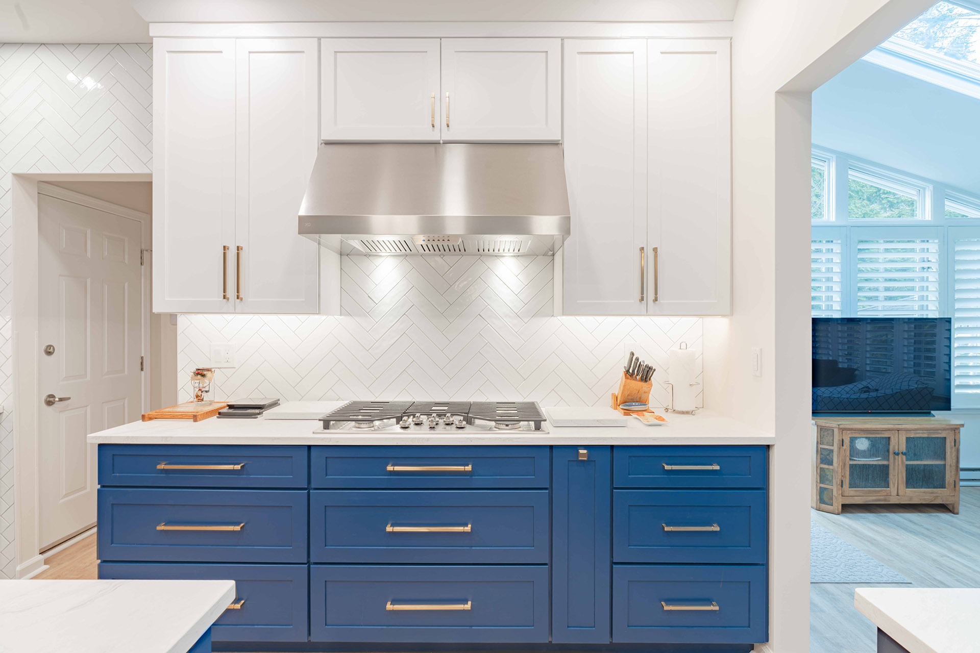 The finishes throughout the new kitchen work together to create a cohesive and elevated environment. Wide-plank luxury vinyl flooring in a warm wood tone runs continuously through the surrounding spaces, establishing visual consistency and natural movement. Polished quartz countertops add a soft, cloud-veined pattern that introduces brightness and dimension. A glossy ceramic backsplash in a herringbone pattern brings texture and sophistication to the range wall. Warm brass hardware and fixtures layer in subtle contrast and give the space a refined sense of character.