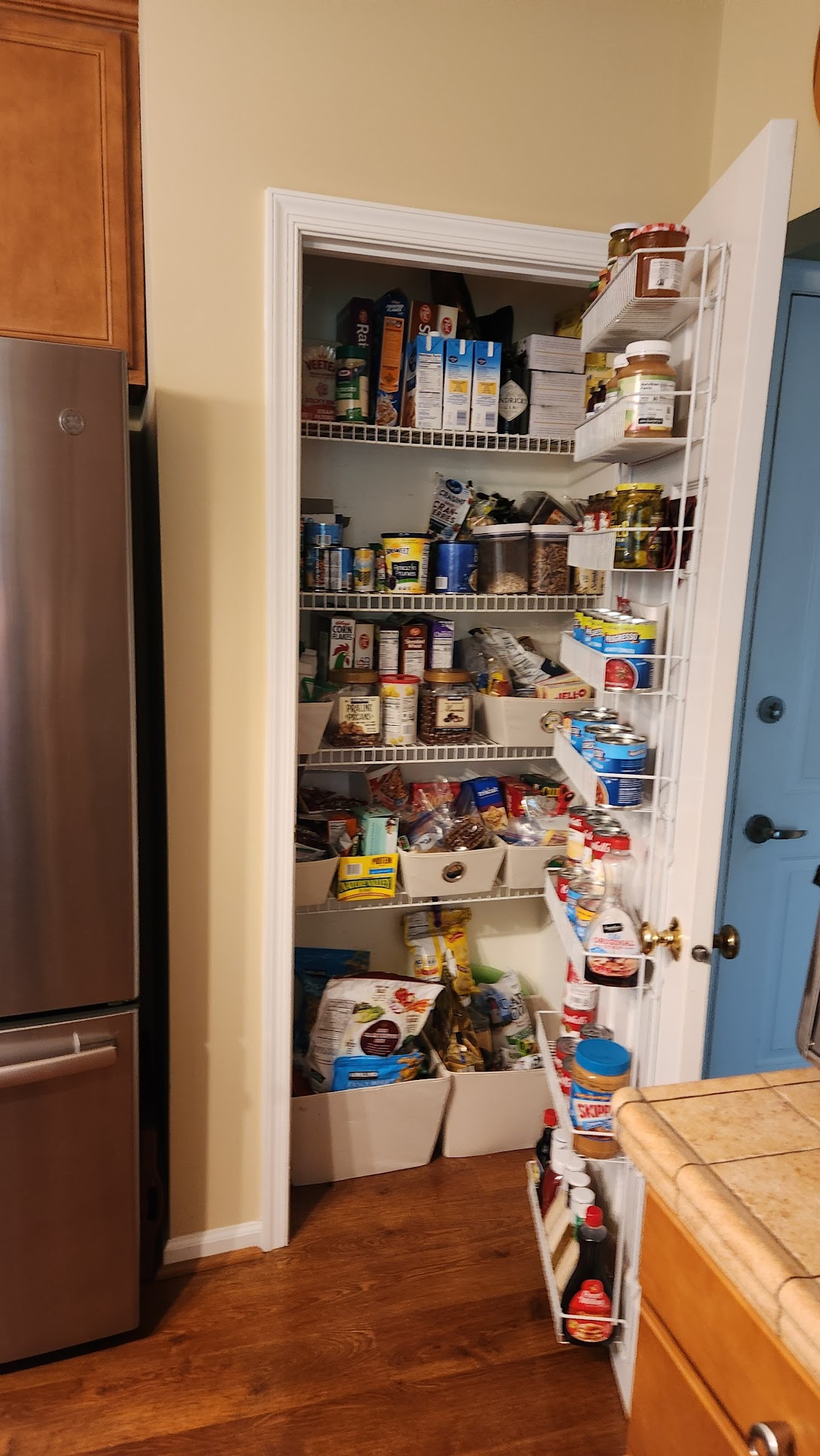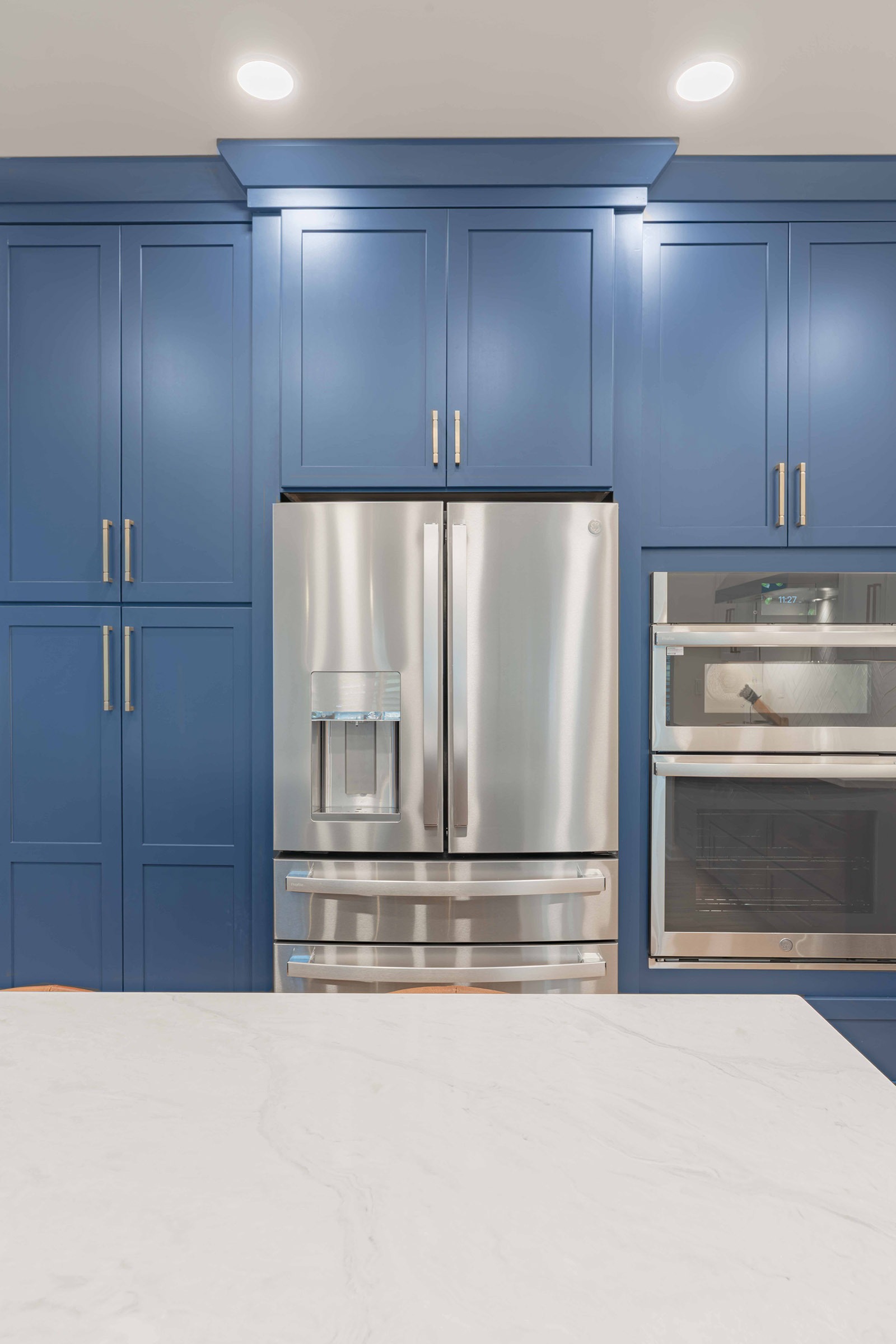 The cabinetry features full-overlay doors in a flat-panel profile for a clean, transitional aesthetic. Deep blue cabinetry is used at the base and pantry walls to ground the space with color and confidence, while soft white upper cabinets around the cooking zone lighten the visual weight and reflect light. Storage is maximized through thoughtful internal organization, including roll-out trays, spice pull-outs, cutlery dividers, a double trash pull-out, and integrated tray storage. Two-piece crown molding, finished end panels, and decorative millwork at the seated island create a furniture-inspired feel that enhances the sense of craftsmanship.