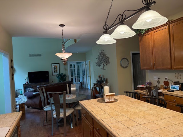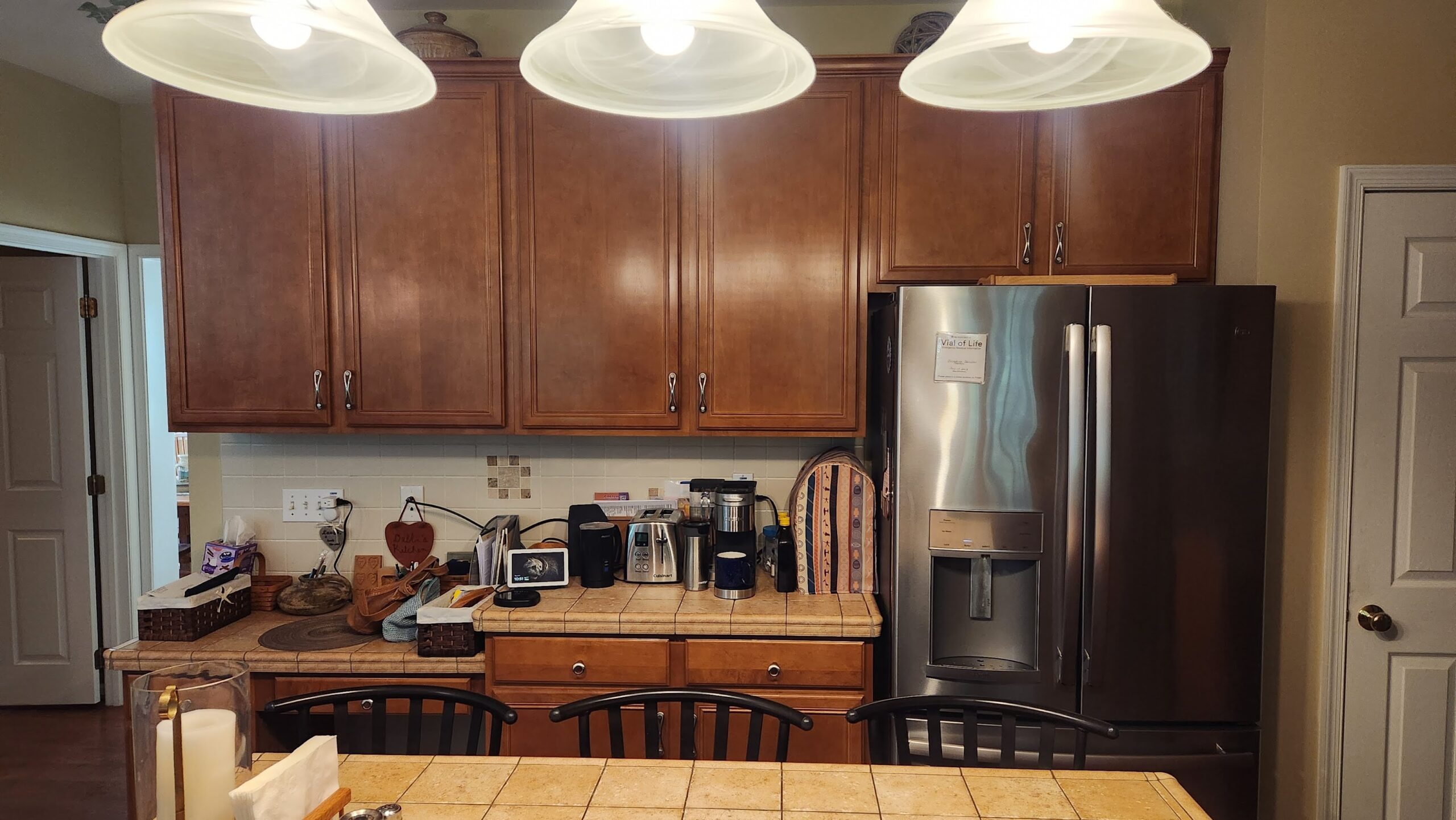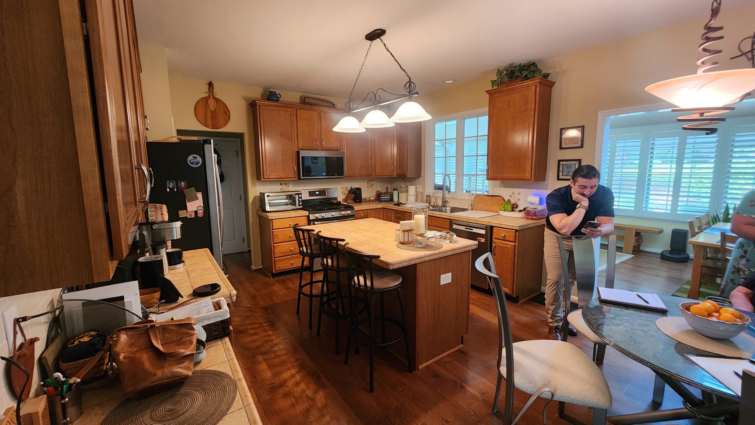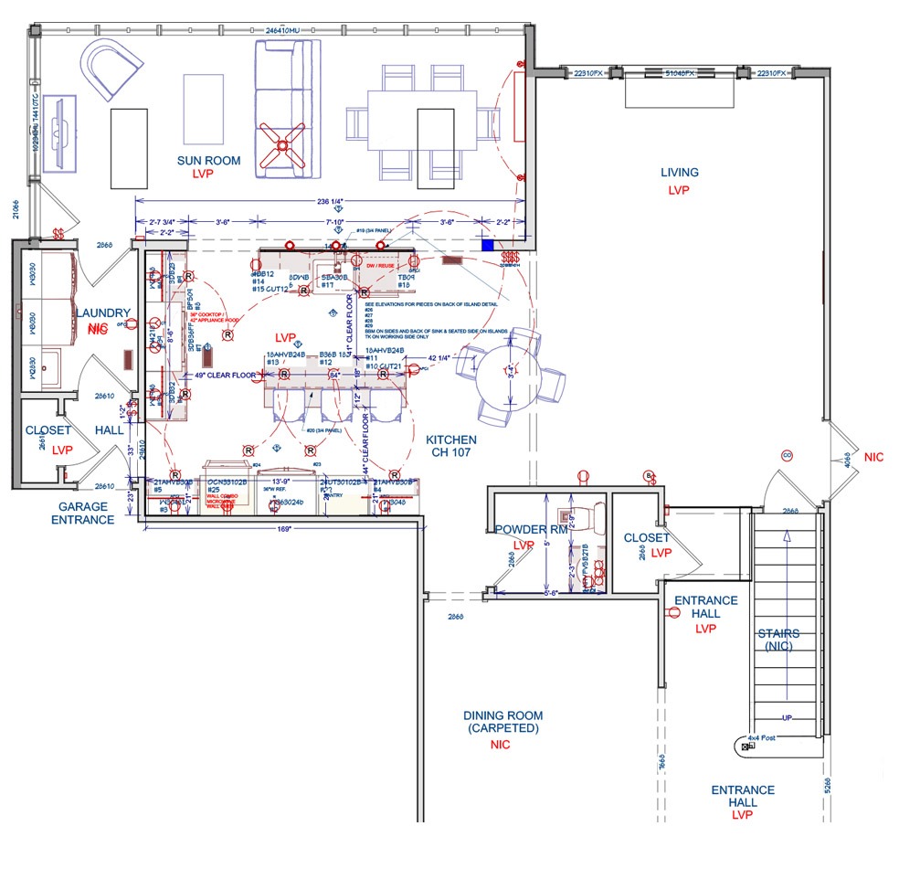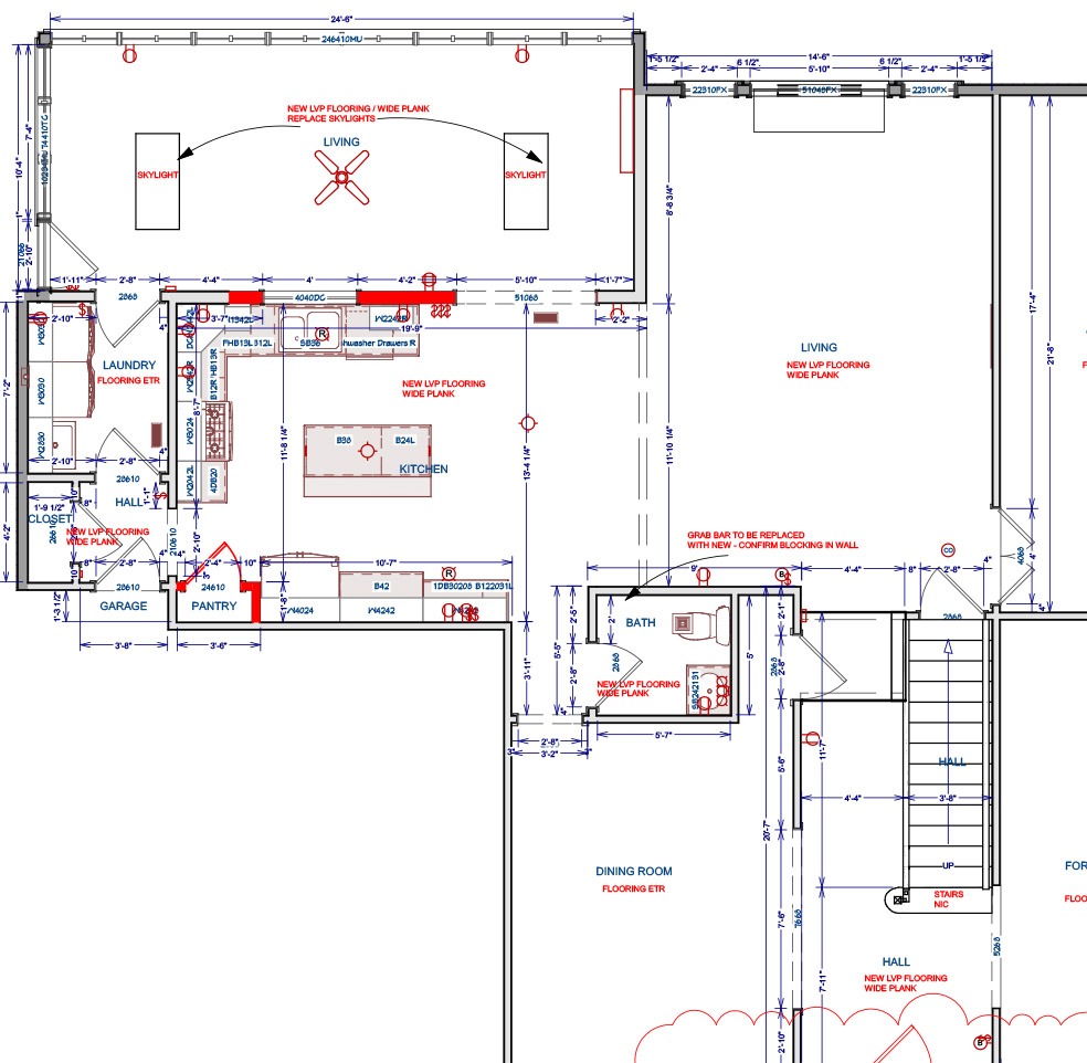 Previously, the kitchen felt enclosed and disconnected from the surrounding rooms. Interior walls and dated finishes limited natural light and flow, and the layout lacked adequate counter space, functional storage, and meaningful landing zones. Heavy wood cabinetry, tile countertops, and traditional lighting contributed to a visually crowded environment that did not support the homeowners’ lifestyle or love of hosting.NEW FLOOR PLAN