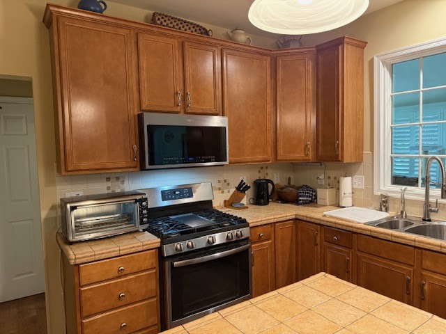 The backsplash features a smooth, glossy ceramic tile installed in a full herringbone pattern that spans the entire range wall and continues into adjoining transitions for a seamless effect. The countertops are crafted in polished quartz with gentle veining, creating a durable and visually calming surface with eased edges and a clean negative reveal at the sink. Coordinating trim at openings and perimeters ensures every finish meets with intention, resulting in a final product that feels thoughtfully composed from every angle.