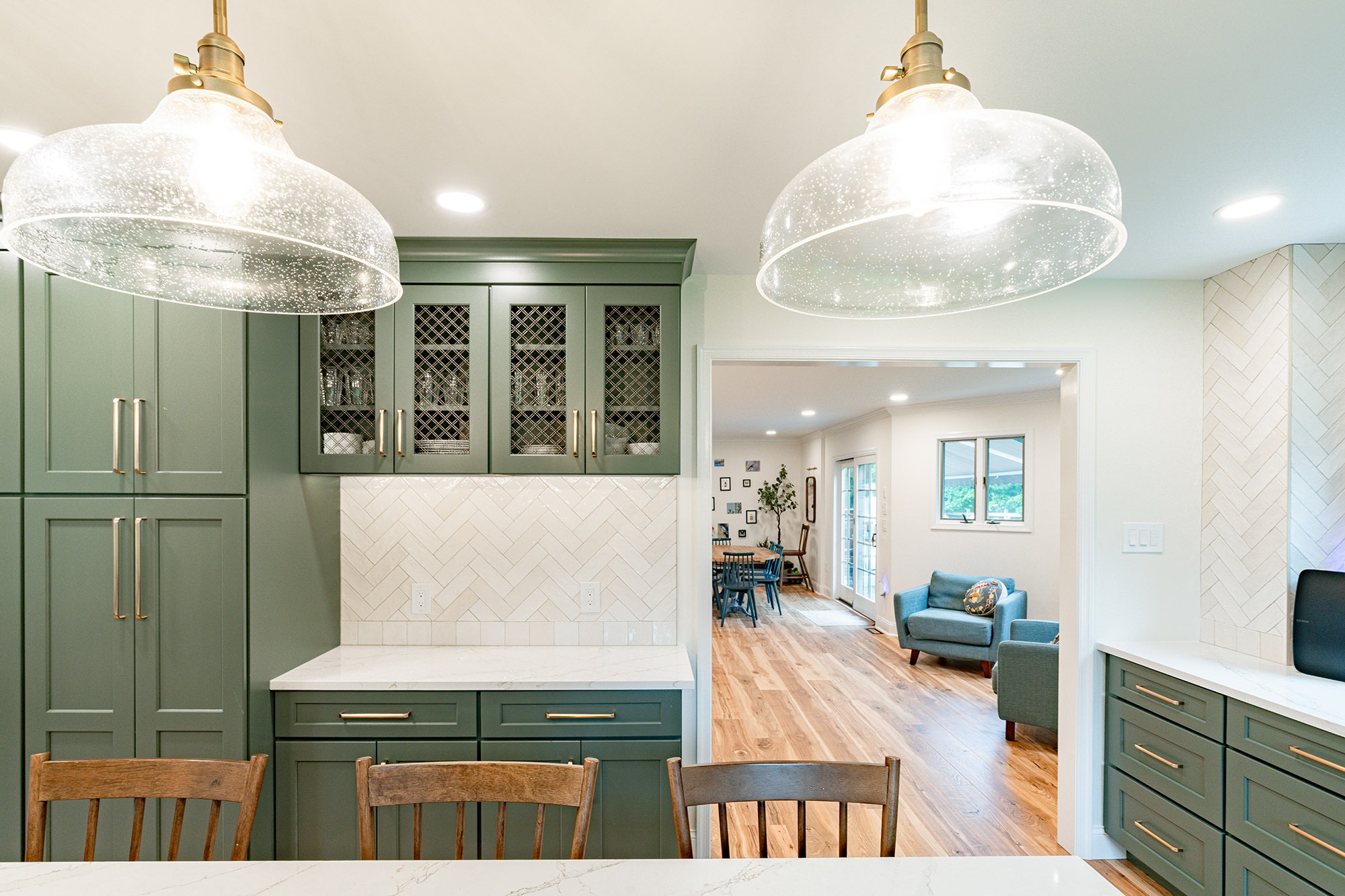 Custom cabinetry was selected for its versatility, craftsmanship, and finish options. In the kitchen, the island and perimeter feature Flat Panel doors in painted Eucalyptus a soft green that adds warmth and depth. Antique brass wire mesh inserts on the upper cabinets of the tall walls lend a custom, heirloom feel.